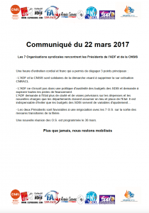 Les 7 Organisations syndicales rencontrent les Présidents de l’ADF et de la CNSIS par Le bureau de l'UNSA Sapeurs-Pompiers | 27 Mar, 2017 Les 7 organisations syndicales des SDIS rencontrent les présidents de l’ADF et de la CNSIS. Découvrez le communiqués commun : #Article précédent Article suivant$ Articles similaires Assemblée générale 2025 Annonces du Président de la République lors de la réception des acteurs mobilisés cet été contre les feux de forêts Rapport de la mission flash « FEUX DE FORET 2022 » L’ensemble des organisations syndicales demande un rendez-vous au Président de la République afin de débattre sur le modèle de la Sécurité Civile Retour sur la réunion de dialogue social du 22 février 2022 à la DGSCGC Retour sur le comité exécutif de l’observatoire national des violences visant les sapeurs-pompiers du 17 février 2022