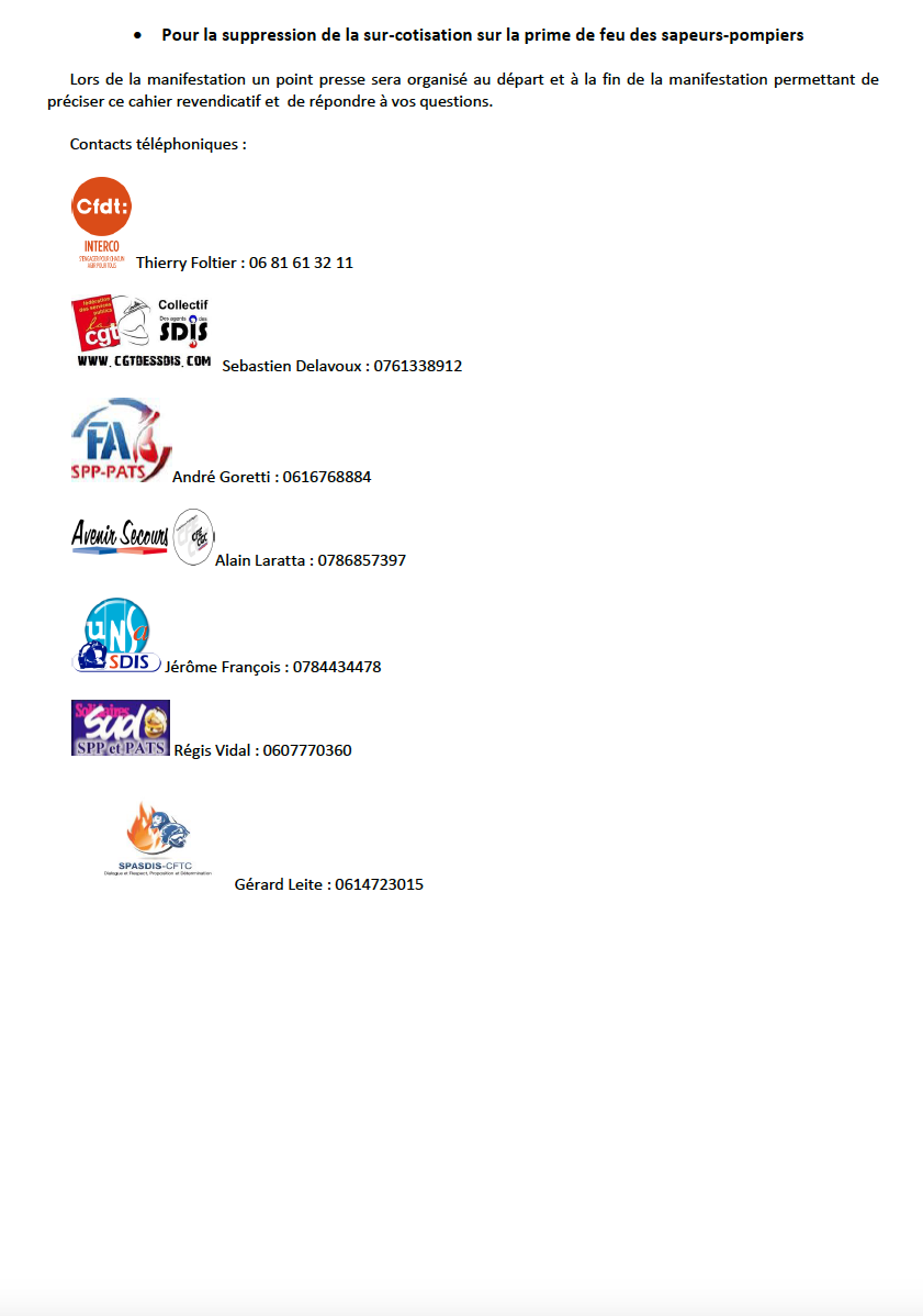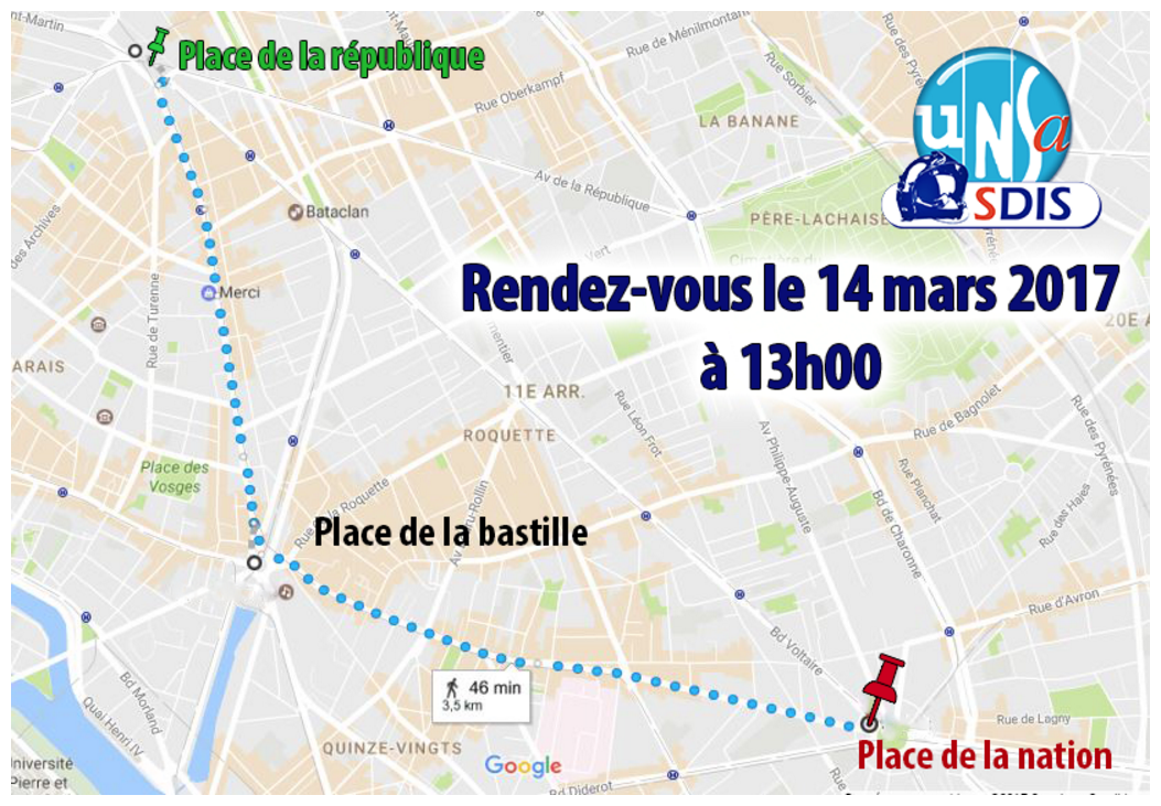 Précisions sur la manifestations du 14 mars à Paris par Le bureau de l'UNSA Sapeurs-Pompiers | 13 Mar, 2017 En amont de la manifestation du 14 mars à Paris, veuillez trouver ci joint plusieurs éléments : COMMUNIQUE DE PRESSE CHARTE DE BONNE CONDUITE TRAJET #Article précédent Article suivant$ Articles similaires Assemblée générale 2025 Annonces du Président de la République lors de la réception des acteurs mobilisés cet été contre les feux de forêts Rapport de la mission flash « FEUX DE FORET 2022 » L’ensemble des organisations syndicales demande un rendez-vous au Président de la République afin de débattre sur le modèle de la Sécurité Civile Retour sur la réunion de dialogue social du 22 février 2022 à la DGSCGC Retour sur le comité exécutif de l’observatoire national des violences visant les sapeurs-pompiers du 17 février 2022